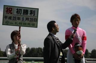 9月20日JRA札幌開催 4R(サラ系2歳500万下 1200m芝)で2歳道営馬が6頭出走し、桑村真明騎手騎乗のイナズマアマリリス号(角川秀樹厩舎 11番人気)が3・4角中団から直線で伸びをみせ優勝(タイム1.10.2 上がり推定34.9)。また、桑村真明騎手はJRA初勝利となりました。