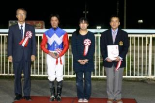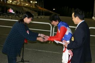 第35回 スタリオン競走表彰プレゼンター 2008.09.24 9月24日、旭川競馬場で第35回「スタリオン競走表彰プレゼンター」が行われました。 第35回目は「ブラックタキシード賞」で、苫小牧市のファンがプレゼンターを務め、 優勝馬トウショウヘリオス号の佐藤調教師(馬主代理)と馬渕繁治騎手にそれぞれ記念品を贈呈しました。 また、プレゼンターには、(株)サラブレッド・ブリーダーズ・クラブから提供された『スタリオンブック』等が贈られました。 写真 上:馬渕繁治騎手へ記念品贈呈 下:関係者と記念写真
