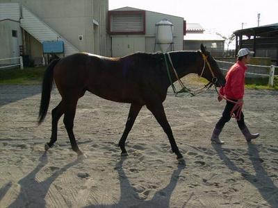 イグゼキュティヴ 札幌2歳 最終調整 2008.10.01 本日(10月1日)イグゼキュティヴ号(牡2 田部和則厩舎)の10月4日札幌2歳ステークス(JpnⅢ)1800m芝にむけた最終調整が門別競馬場内走路で行われました。 馬体重 486kg、15―15(単走)の微調整。 (鹿島厩務員騎乗コメント) 「体調・調子とも万全に仕上がっています。はみを噛み、気持ちを前に出していましたし気配が良いです。」 写真・取材 古谷剛彦氏