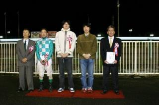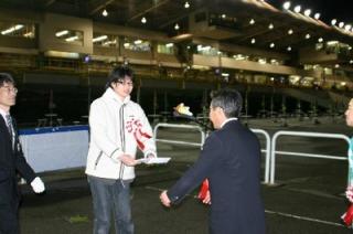 第40回 スタリオン競走表彰プレゼンター 2008.10.09 10月9日、旭川競馬場で第40回「スタリオン競走表彰プレゼンター」が行われ ました。 第40回目は「テイエムオペラオー賞」で、江別市のファンがプレゼンターを務め、 優勝馬メジャーサイレンス号の村上正和調教師(馬主代理)と宮崎光行騎手にそれぞれ記念品を贈呈しました。 また、プレゼンターには、日高軽種馬農業協同組合から提供された『スタリオンブック』等が贈られました。 写真 上:村上調教師へ目録贈呈 下:関係者と記念写真