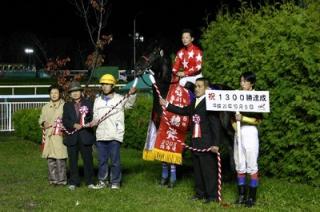 五十嵐冬樹騎手 1300勝達成! 2008.10.09 10月9日、五十嵐冬樹騎手(桑原義光厩舎)が、旭川競馬第9レース コンテ号に騎乗し、平成5年札幌競馬場でのデビュー以来、8、319戦目で通算1300勝を達成しました。 五十嵐騎手は深川市の出身で今年度、ワンダフルクエスト号で第19回ブリーダーズゴールドジュニアカップ、ラブストレングス号で第3回道営スプリント、コンテ号で第41回瑞穂勝で重賞3勝しています。 写真 五十嵐冬樹騎手1300勝達成の口取り写真