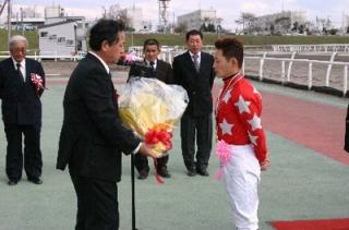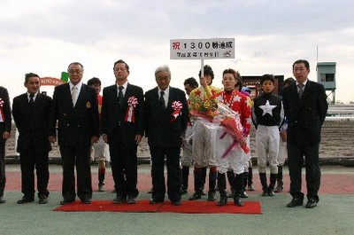 五十嵐冬樹騎手 1300勝達成表彰式 2008.10.28 10月28日、旭川競馬場で10月9日に1300勝を達成した五十嵐冬樹騎手(桑原義光厩舎)の表彰式が門別競馬場スタンド正面パドックで行われ、多くのファンや関係者の祝福を受けました。 表彰式終了後には、五十嵐冬樹騎手から集まったファンに花束がプレゼントされました。 また、小林靖幸騎手がプラカード持ちを務めてくれました。 写真 上:北海道調騎会から花束の贈呈 下:参加者全員で記念写真
