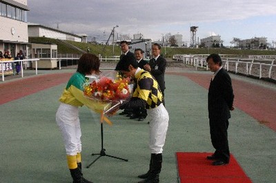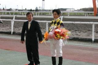 吉田稔騎手 期間限定騎乗終了! 2008.10.30 平成20年10月15日から期間限定騎乗として、ホッカイドウ競馬に参戦していた愛知競馬の「吉田稔騎手」が、10月30日期間終了をむかえ、門別競馬場で送別式が行われました。 送別式では、笹木美典騎手から花束が贈呈され、別れを惜しむファンからはサインを求められ、快く応じていました。 吉田稔騎手コメント 「短い間でしたが、とても気持ちよくレースに乗れました。機会があったら、また北海道に来ます。」 写真 上:笹木美典騎手から花束贈呈 下:柳澤調教師と吉田稔騎手