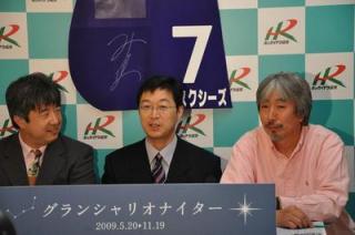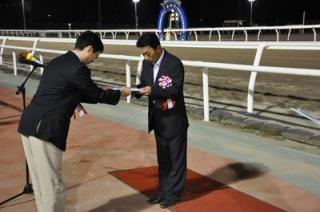 (社)JBC協会協賛 スタリオンシリーズ2009「タップダンスシチー賞」 2009.06.09 メインレースは、スタリオンシリーズ「タップダンスシチー賞」。(株)サラブレッド・ブリーダーズ・クラブの遠藤幹業務部長に、パドック解説をしていただき、タップダンスシチーの近況などを話していただきました。 また、表彰式では、優勝馬タグハンター号の馬主田口廣氏(代理松本隆宏調教師)にタップダンスシチー号の2010年度種付権利が贈呈されました。 写真上:写真中央 パドックゲスト解説の遠藤幹氏 写真下:表彰式