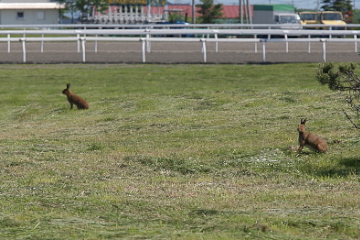 初夏の風わたる門別競馬場。優しさと耳を振り回し、ノンビリ草を食べたり走り回ったりしている姿を、ご来場の際には双眼鏡などご持参され、競馬場の自然界の一つ、お探しされるのはいかがでしょうか。(※数は、通常の小動物を数える「匹」を使用。)