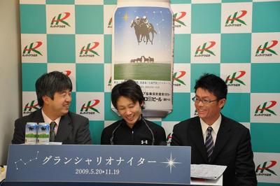 「来週の展望」にスペシャルゲスト登場!! 2009.06.19 ホッカイドウ競馬の全レース終了後、その日のレース解説や次週の注目レースの展望などを紹介する「来週の展望」(火・水は、明日の展望) に本日の第13回北海道スプリントカップ(JpnⅢ)、ポートジェネラル号に騎乗した高知のリーディングジョッキー赤岡修次騎手がスペシャルゲストとして登場しました。リニューアルとなった門別競馬場「グランシャリオナイター」の感想や来月7月24日から始まる高知の「夜さ恋ナイター」への抱負について笑顔をまじえ話していただきました。