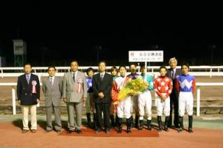 佐々木国明騎手 600勝達成表彰式 2009.08.18 8月18日(火)、門別競馬場で8月11日(火)第7レースファイヤーアップ号に騎乗し通算600勝を達成した佐々木国明騎手(若松平厩舎)の表彰式がウイナーズサークルで行われ、多くのファンや関係者の祝福を受けました。 表彰式終了後には、集まったファンに花束がプレゼントされました。 (プラカード 川島雅人騎手)