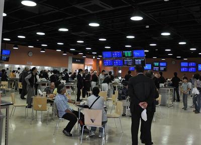 11時から開所式・関係者の方々によるテープカットが行われ、14時より先着プレゼント等のファンサービスが実施されました。また、ホッカイドウ競馬パドック解説でお馴染みの古谷剛彦氏(㈱JRDB)による出前解説も行われ、大変盛況となりました。スポーツBARのような売店「CafeAiba」や30名収容の地域交流室など多目的にゆったりと楽しめる場外発売所となっておりますので、近隣にお住まいの方は、ぜひAiba登別室蘭にご来場下さい。