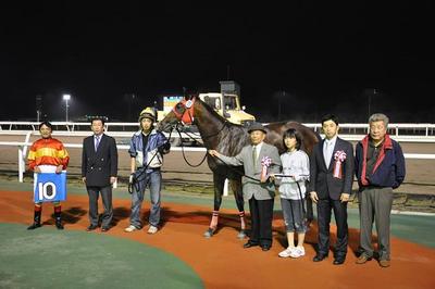 2歳牝馬オープン ルールオブロー賞 結果 2009.09.24 9月24日(木)、2歳牝馬オープン「ルールオブロー賞」が行われ、井上俊彦騎手鞍上の2番人気ショウリダバンザイ号が2着ミサトサウス号にクビ差をつけて優勝しました(タイム1分13秒1)。 また、このレースのパドック解説では、ダーレー・ジャパン株式会社ノミネーションオフィス 加治屋正太郎氏に出演していただき、種牡馬ルールオブローの近況について話していただき、表彰式のプレゼンターも務めていただきました。