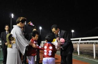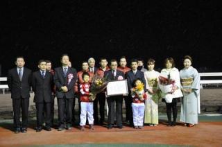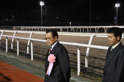 黒川武 調教師勇退式 2009.11.19 11月19日(木)、第6レース終了後に、今年の開催をもって勇退される黒川武調教師(69歳)の勇退式がウイナーズサークルで実施され、多くの関係者やファンから花束が贈られました。