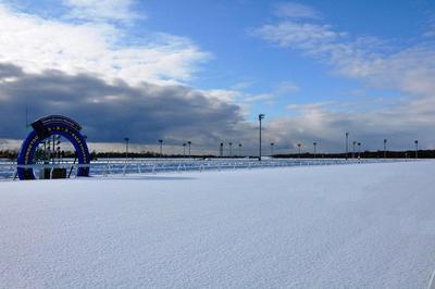 年明け早々に寒波が到来し、すっかり冬景色となった門別競馬場(写真上)。11日(月)から本年の調教がスタートするため、調教コース(内馬場)の雪を排雪し、現在凍結したクッション砂を起す作業が行われております。