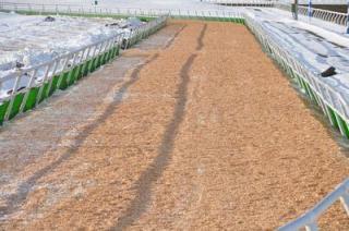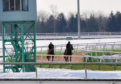 門別競馬場コース内500メートル走路(通常:追馬場)をウッドチップコースへの改修工事が1月15日(金)に竣工し(写真1・2)、現在、入厩している2歳馬を中心に利用が始まりました(写真3)。