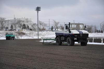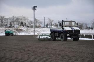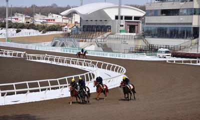 3月3日“名残の雪”。門別競馬場に暦どおり少しずつ春が訪れてきました。本コースの積雪もすっかり除雪され、3月1日(月)より本コースが使用できるよう、馬場管理スタッフの懸命な作業(写真1)により、予定どおり使用可能となりました(写真2)。また、調教メニューにゲート練習が加わり、能力検査に向けての本格的な調教が行われています。