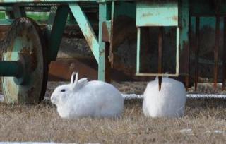 “名残の雪”ではありませんが、まだ冬支度の門別競馬場のサブキャラクター「野ウサギ」の近況をお楽しみ下さい(写真3)。きゅう舎内での話しでは、2匹のウサギは「ハクホウリリー」を見て、《不思議の競馬場》状態だそうです。