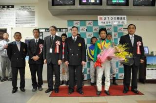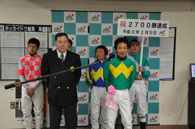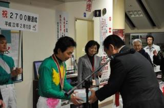 山口竜一騎手 2,700勝達成表彰式 2010.04.28 2月10日(水)、期間限定騎乗中の笠松競馬場で第6レーステイオープリンス号に騎乗し、2,700勝を達成した山口竜一騎手(桧森邦夫厩舎)の表彰式がスタンドで行われ、ファンの方々や関係者の皆様の祝福をいただきました。表彰式終了後には、山口竜一騎手から集まったファンに花束がプレゼントされました。(プラカード川島雅人騎手)