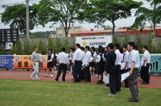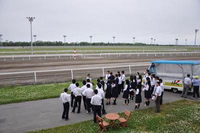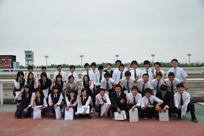 北海道静内農業高等学校 生徒35名が門別競馬場を見学 2010.06.30 ユメロマンや、ホッカイドウ競馬ではお馴染みのサクラホウジュ・シュペールなど次々と実績馬を生産し、毎年注目を集めている北海道静内農業高等学校の 生産科学科生徒35名が、研修として、門別競馬場に来場し、パドックや検量などを見学。検量前では、川島洋人騎手から実際使用している競走鞍を見せてもらうなど興味津々の様子でした。