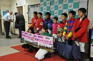 8月11日(水)、「第2回ジョッキーベイビーズ」の北海道予選決勝が門別競馬場で開催され、8月1日にJRA日高育成牧場で行われた選考会で選出された8名のジョッキーが出場しました。伊藤萌さん(小学校4年生)のスターターで始まり、直線300メートルを元気よく疾走しました。優勝したのは、2番サンジ号に騎乗した福久紗蘭さん(小学校5年生)で2着のハク号に騎乗した根本ひなたさん(小学校6年生)とともに11月7日(日)にJRA東京競馬場で行われる決勝レース(第2回ジョッキーベイビーズ)への出場権利を獲得しました。