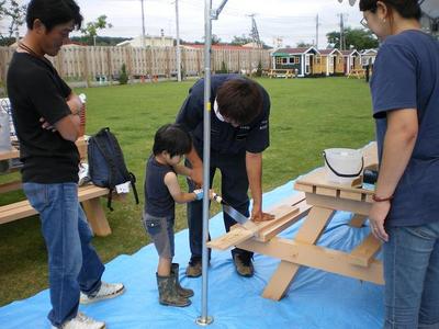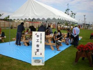 第3回 「夏休み親子木工教室」の開催(門別競馬場) 2010.08.18 夏休み特別企画「夏休み親子木工教室」(中学生以下を対象)の第3回目がとねっこ広場で開催され、総勢10組22名のご家族が参加し、職人の指導のもと道産カラマツ間伐材を利用した「子馬プランター」を制作しました。制作終了後には、特典の “とねっこジンギスカン(2~3人前)”を楽しみました。