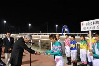 川島洋人騎手 900勝達成表彰式 2010.08.25 8月24日(火)、第2レース パウロ号に騎乗し、中央・地方通算900勝を達成した川島洋人騎手(田中正二厩舎)の表彰式がウイナーズサークルで行われ、ファンの方々や関係者の皆様の祝福をいただきました。