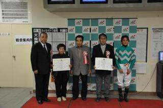 また、協賛競走の表彰式では、様似町長 坂下 一幸様より優勝馬プレミアムカフェ号の関係者に副賞が贈られました。