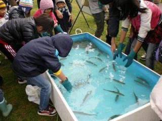 競馬場内コースでは、第6回浦河ジュニア・ジョッキー杯やジョッキージョッキー競走を実施。とねっこ広場では、日高のアイドル 白毛のポニー「小雪ちゃん」の展示やポニー体験乗馬、ヤマメのつかみ取り大会やホースシューズなどが行われました。