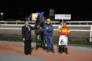 口取り写真では、櫻井拓章騎手がプラカードを持ってくれました。なお、1,500勝達成の表彰式は、11月17日の第10競走本馬場入場後(19:05頃)ウイナーズサークルで実施予定です。
