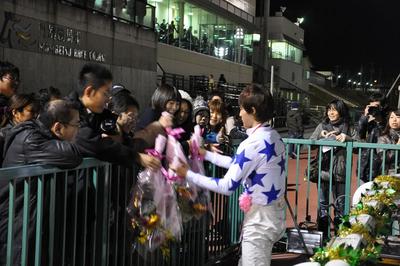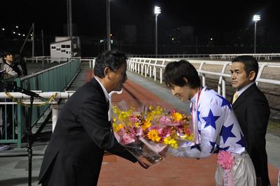桑村 真明 騎手 300勝達成表彰式 2010.11.18 11月17日(水)、第7レースサルサデラルス号に騎乗し、中央・地方通算300勝を達成した桑村真明騎手(角川秀樹厩舎)の表彰式が11月18日(木)第9競走終了後、ウイナーズサークルで行われ、ファンの方々や関係者の皆様の祝福をいただきました。