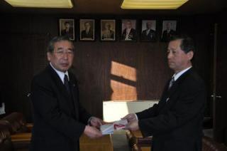 24日16:30、北海道調騎会若松 平会長が日高町役場を訪問し、三輪 茂日高町長に義援金を手渡しました。義援金は日高町を通じ日本赤十字社に送られる予定です。