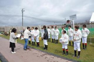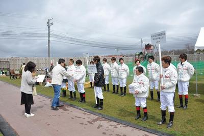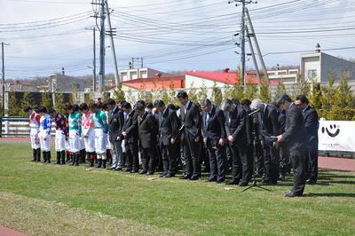 復興支援として開幕した門別競馬場では、午前10時の開門と同時にホッカイドウの騎手(北海道調騎会騎手部会)とトレセン町内会女性部による募金活動が行われ、第1R前には、主催者・調教師・騎手による黙祷を行いました。