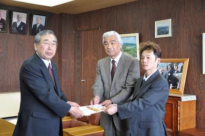 写真:三輪茂 日高町長(左)へ義援金を手渡す五十嵐冬樹騎手と井村専務理事(右)