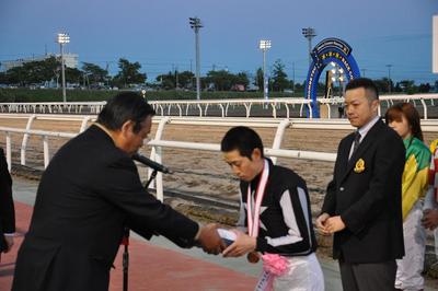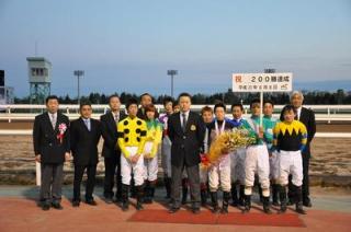 岩橋 勇二騎手 200勝達成表彰式 2011.06.15 6月8日(水)、第12レース サンレイレーザー号に騎乗し、通算200達成した岩橋勇二騎手(田中淳司厩舎)の表彰式が6月15日(水)第9競走終了後、ウイナーズサークルで行われ、ファンの方々や関係者の皆様の祝福をいただきました。