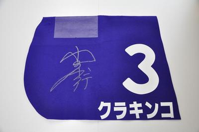 6月2日(木)週刊ギャロップ杯第8回星雲賞(H2)を優勝したクラキンコ号のゼッケン(小国博行騎手サイン入り)とオリジナルクオカードをプレゼントいたします(第8回星雲賞優勝時)。ご提供:倉見利弘様