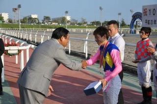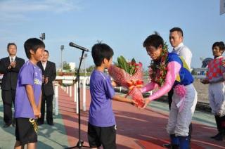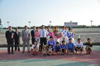 服部 茂史騎手 1,000勝達成表彰式 2011.08.12 8月10日(水)第6レースビービーモリガン号に騎乗し、地方・中央通算1,000達成した服部茂史騎手(田中淳司厩舎)の表彰式が第5競走終了後、ウイナーズサークルで行われました。