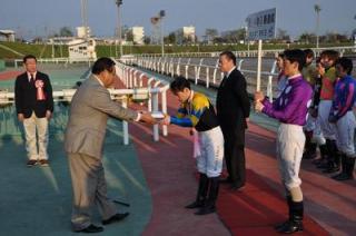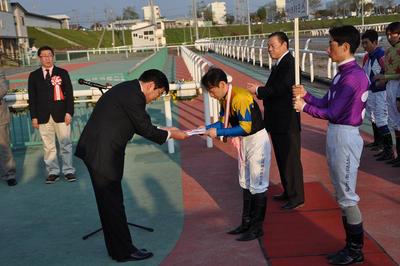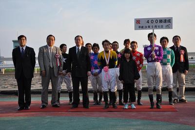 沼澤 英知騎手 400勝達成表彰式 2012.05.17 昨日の5月16日(水)第9レースでサクラサライ号に騎乗し、地方・中央通算400達成した沼澤 英知騎手(桧森 邦夫厩舎)の表彰式が本日の第6競走終了後、ウイナーズサークルで行われました。