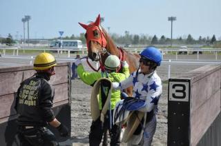 桑村 真明騎手 復帰 2012.05.30 5月31日(水)、門別競馬第1レースで、5月1日(火)に調教中の事故で負傷し、入院加療していた桑村 真明騎手がレースに復帰しました。 本日は合計6レースに騎乗し、復帰2戦目で1着となり、ファンに復活をアピールしました。 復帰戦(1R)後の桑村 真明騎手コメント 「久々の騎乗だったので、レース前は不安もありましたが、問題なく騎乗出来てよかったです。これからもひとつひとつ大切に騎乗して頑張っていきたいです。」 写真:復帰戦(1R)レース後の桑村 真明騎手