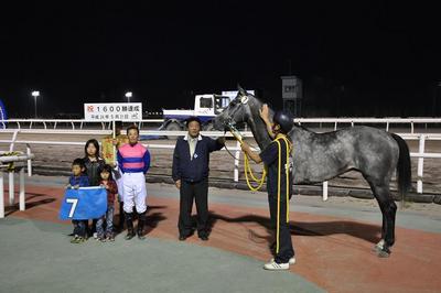 口取り写真では、小林靖幸騎手がプラカードを持ってくれました。なお、1,600勝達成の表彰式は、6月5日(火)にウイナーズサークルで実施予定です。