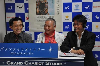 本日のグランシャリオスタジオ(6月28日) 2012.06.28 第9競走のパドック解説ゲストとして、Dr.コパ氏が出演し、注目を寄せる所有馬達の近況について話して頂きました。 第11競走のパドック解説のゲストには、有限会社坂東牧場 社長 坂東正積氏が出演し、同牧場の育成馬の近況や門別競馬場の感想について話して頂きました。 開催期間中に様々な競馬関係者が訪れるグランシャリオスタジオ 来週以降もぜひお見逃しなく! 写真上:Dr.コパ氏 写真下:坂東 正積氏