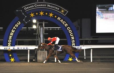 本日6月28日(木)、門別競馬場では日本一早い2歳重賞、TVh杯第37回栄冠賞(H2)〔シンボリクリスエス賞〕が行われ、五十嵐冬樹騎手騎乗の単勝3番人気シーギリヤガール号が、2着アウトジェネラル号に2馬身差をつけて優勝しました(タイム1.14.1)。管理する齊藤 正弘調教師は開業2年目にして、重賞初出走・初制覇。同馬は、これで上級認定競走を優勝し、7月14日(土)JRA函館2歳ステークス(GⅢ)の出走資格を満たしました。