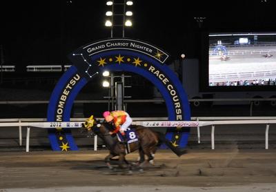 全国各地で行われる牝馬重賞を競走成績によりポイントを付与して優勝馬を決定する世代別牝馬重賞シリーズ「GRANDAME-JAPAN2012」。7月26日(木)、古馬シーズンの第3弾となる「サンケイスポーツ杯第11回ノースクイーンカップ(H2)[ワークフォース賞]」が行われ、井上 俊彦騎手騎乗の単勝1番人気ショウリダバンザイ号が大外一気の追い込みで、2着 サクラサクラサクラ号にハナ差の大接戦を制して優勝しました(タイム1.57.1)。ショウリダバンザイ号は昨年と一昨年に引き続きノースクイーンカップ3連覇を達成しました。