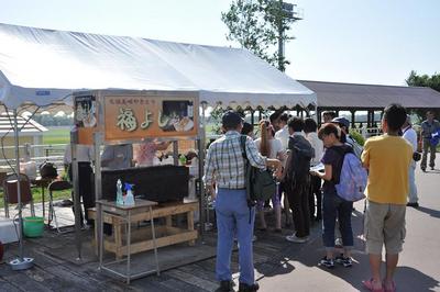 『元祖美唄やきとり福よし』が臨時出店(門別競馬場) 2012.08.30 門別競馬場のとねっこ広場では、全国的な知名度を誇る「元祖美唄やきとり福よし」が臨時出店し、限定800本の美唄やきとりが販売されました。 来場者先着100名様には、美唄やきとりが2本プレゼントされ、その中から抽選で20名様に美唄産グリーンアスパラ「雪蔵美人」(150g)が当たる抽選会が開催されました。 協賛:美唄市 元祖美唄やきとり福よし 美唄市農業協同組合
