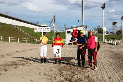 口取り写真では、櫻井 拓章騎手がプラカードを持ってくれました。なお、1,600勝達成の表彰式は、9月5日(水)の第10競走本馬場入場後にウイナーズサークル(雨天時はスタンド)で実施予定です。