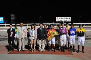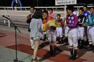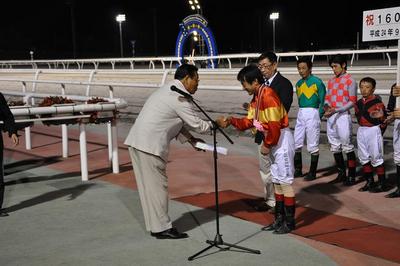 井上 俊彦騎手1,600勝達成表彰式 2012.09.05 9月4日(火)、地方・中央通算1,600勝を達成した井上 俊彦騎手(林 和弘厩舎)の表彰式が本日の第9競走終了後、ウイナーズサークルで行われました。