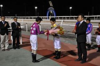 本日、門別競馬場では、名古屋競馬所属の吉田稔騎手の引退セレモニーをウイナーズサークルで実施しました。