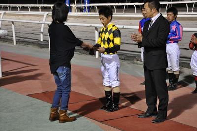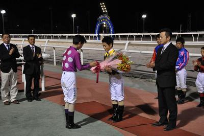 ホッカイドウ競馬でも、平成20年から5年連続で期間限定騎乗している経緯と長年の功績を称えて、画家 飛渡さゆりさんから昨年の道営記念優勝ショウリダバンザイ号の絵画が記念品として贈呈されました。また、櫻井 拓章騎手部会長や関係者の皆様から花束が手渡され、最後の騎乗となるステイヤーズカップを迎えました。ステイヤーズカップでは、ジョーモルデュー号に騎乗し5着に入着した吉田騎手。引退後は、日高管内で育成牧場を開業する予定です。今後の活躍に期待です。