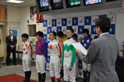 新人・移籍・期間限定騎手 紹介セレモニー 2013.04.24 本日の第1競走開始前に、スタンドで福山から移籍した松井伸也騎手(齊藤正弘厩舎)と本年デビューの石川 倭騎手(米川昇厩舎)、井上幹太騎手(原孝明厩舎)と7月18日まで期間限定騎乗する高野 誠毅騎手(田中淳司厩舎)の紹介サレモニーが行われ、それぞれ今年にかける抱負を話しました。 写真:セレモニーの様子