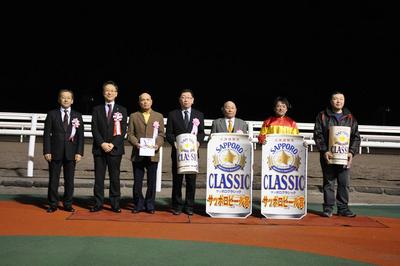 本日は、サッポロビール杯第3回コスモバルク記念(H2)[コンデュイット賞](ダート1,800m 曇・稍重)が行われ、1番人気ショウリダバンザイ号が2着ジョーモルデュー号に3馬身差をつけ優勝しました(タイム:1.55.5)。
