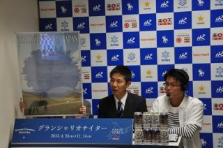 本日のグランシャリオスタジオについて(9月26日) 2013.09.26 第10競走のパドック解説のゲストに静内軽種馬生産振興会青年部長の岡田 紘和氏にご出演して頂き、協賛競走名となっている「サイアーラインポスター」の制作秘話や注目馬の1頭などのご紹介をしていただきました。