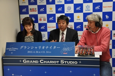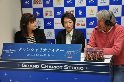 豪華ゲスト多数出演 本日のグランシャリオスタジオ(11月14日) 2013.11.14 本日のグランシャリオスタジオは、最終日を飾る豪華ゲストが多数出演しました。 まず、第8競走のゲストには、橋本聖子参議院議員が出演し、ホッカイドウ競馬や競馬産業全体へ激励のメッセージを頂きました。 続いて、今年の新設重賞第11競走HBA賞ブロッサムカップのゲストには、日高軽種馬農業協同組合市場副委員長である古川雅且氏が出演し、ブロッサムカップの注目馬などについて話して頂きました。