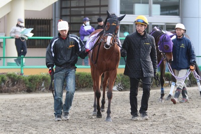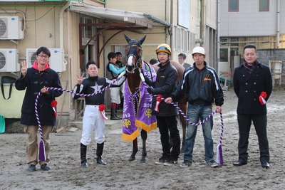 「ゲート決まれば行ってほしいと伝えてあったんですが、今回は割りと上手に出てくれたし、他馬もあまり出てこなかったのですんなりハナに行かせてもらえて、これで大丈夫かなとは思いました。道中は、ゆったりした気持ちで見ていることが出来ましたね。園田の時もそうでしたが、とにかく道中遊びながら走っているような馬なので、今日のように他馬が詰めてきてくれるような流れの方がより能力を発揮できるんじゃないかと思います。長距離の輸送続きの中、へこたれることなく頑張り続けてくれましたし、グランダムのチャンピオンも決められたと思いますので、今季はこれがラストになりますね。こうしたシリーズレースに他場に遠征して挑む場合、とにかくまず馬自身が慣れない長距離の輸送に対応できないようなら厳しいわけで、そんな中を3場も転戦して全て勝ってくれたわけですから、馬には本当に頭が下がりますね。応援していただき、ありがとうございました。」