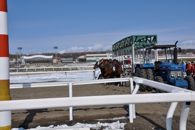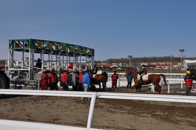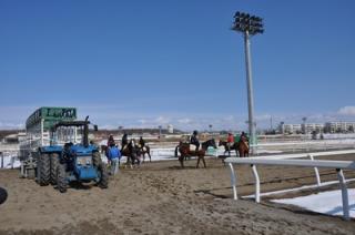 能力検査にむけて 2014.03.11 現在、門別競馬場には2歳馬が530頭在きゅうしており、3月19日から行われる能力検査(デビューするための検査)に向け、坂路調教・馬場調教はもちろん、発走練習などレースで走るために必要な能力も磨いているところです。昨年はハッピースプリント号がNAR年度代表馬のタイトルを獲るなど、多くの2歳馬が他地区で活躍しました。今シーズンは昨年より多くの2歳馬がデビューし、ホッカイドウ競馬をはじめ、全国の競馬場での活躍を期待しています。